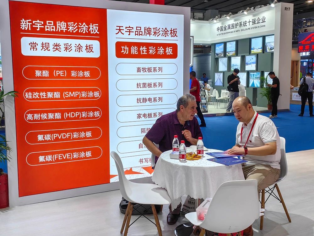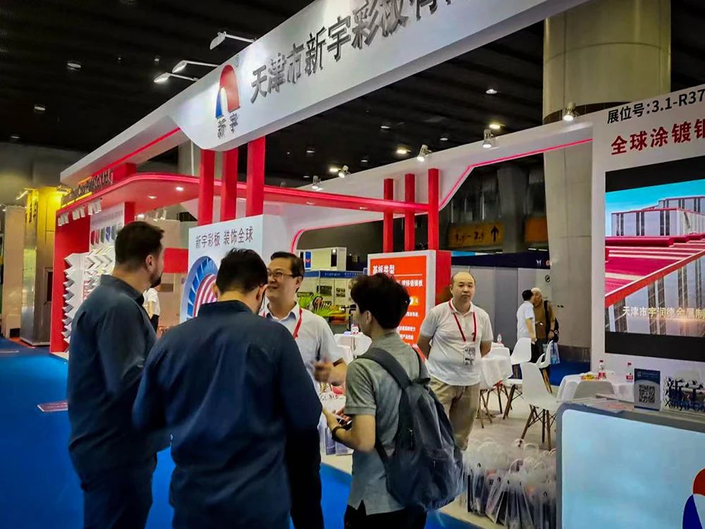 展覽開幕首日,現(xiàn)場(chǎng)人潮涌動(dòng),眾多行業(yè)頭部企業(yè)齊聚一堂。天津市新宇彩板有限公司攜旗下鍍鋅板、鍍鋁鋅板、鍍鋅鋁鎂板等全系涂鍍產(chǎn)品盛裝亮相3.1-R37展位,憑借過硬的產(chǎn)品性能和全面可靠的解決方案,吸引眾多采購(gòu)商咨詢洽談。